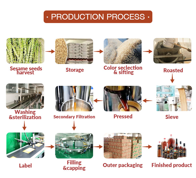 الضغط المادي النقي: يتم إنتاج زيت السمسم عالي الجودة في الغالب من خلال الضغط المادي (مثل طريقة استبدال الماء لزيت السمسم المطحون صغيرًا)، دون استخدام المذيبات الكيميائية، وبالتالي الحفاظ على النكهة الطبيعية والتغذية للسمسم إلى أقصى حد.